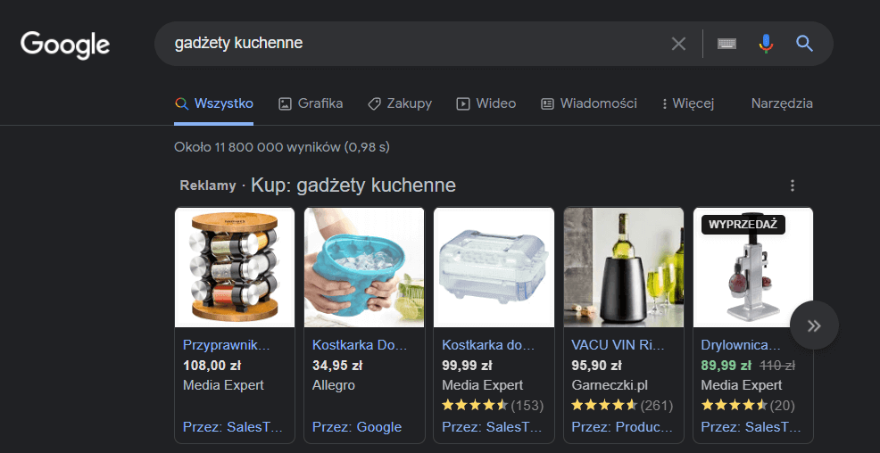 Klient reprezentował całkowicie nowy i nierozpoznawalny sklep z artykułami kuchennymi w modelu dropshipping. Start działań promocyjnych w systemie reklamowym Google nastąpił w listopadzie 2020 roku. Klient zaczynał z budżetem na ten cel wielkości 1600 zł/miesiąc. Obecnie na reklamy w Google przeznaczana jest kilkakrotność startowej kwoty. Co więcej, klient zdecydował się na otworzenie nowego sklepu na tej samej platformie dropshippingowej, który również mamy przyjemność promować. Współpraca trwa do dziś.