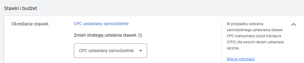 Dla kampanii produktowej zdefiniowana została strategia ustalania stawek „CPC ustawiane samodzielnie”. Tak jak wspomniano we wstępie – był to nowy sklep, pozbawiony danych o konwersjach. W tym przypadku inteligentne strategie ustalania stawek mogłyby nie zdać egzaminu ze względu na brak danych będących fundamentem prawidłowej pracy algorytmów Google.