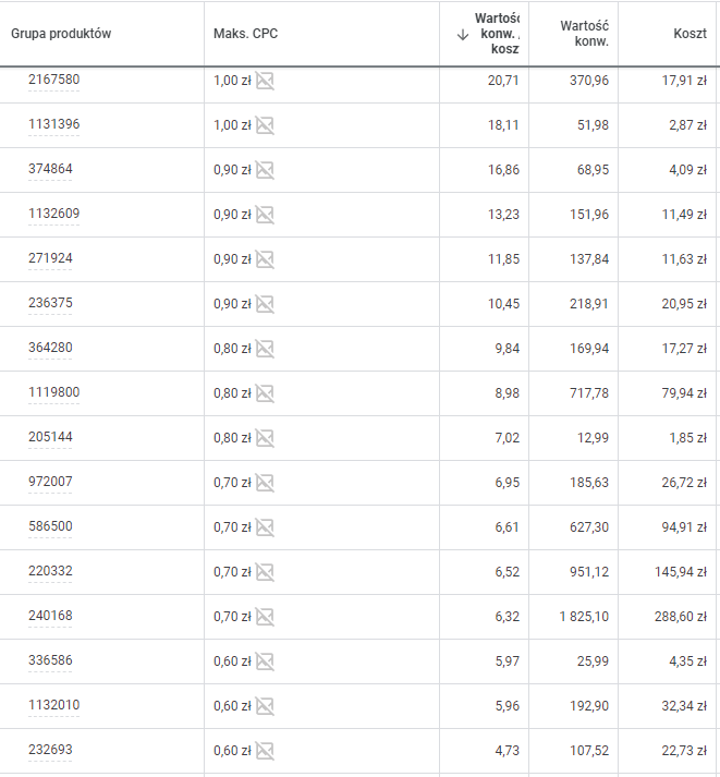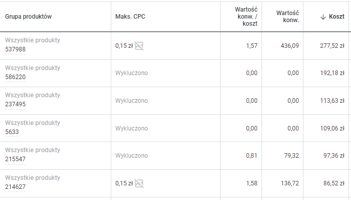 W samodzielny sposób sterowaliśmy stawkami „maks. CPC” dla poszczególnych produktów. Dla artykułów o zadowalającej wartości ROAS (wartość konwersji/koszt) zwiększaliśmy stawki po to, aby ich reklamy wyświetlały się wyżej i częściej. Natomiast dla produktów o niskiej wartości ROAS bądź o zerowej sprzedaży zmniejszaliśmy stawki. W ten sposób reklamy tych produktów wyświetlały się rzadziej, a co za tym idzie – wykorzystywały mniejszą kwotę z budżetu. W przypadku, gdy koszt kliknięć przy danym produkcie przewyższał jego cenę, podejmowana zostawała decyzja o jego wykluczeniu z wyświetlania. Sterowanie stawkami dokonywane było wprost proporcjonalnie do wartości ROAS.
