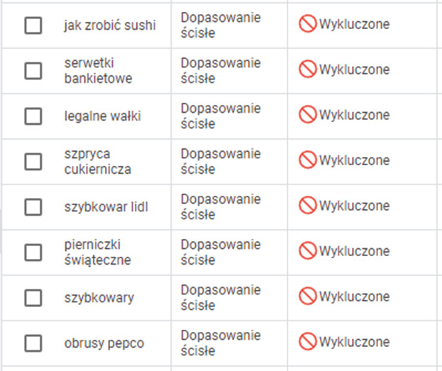 Mając na uwadze powyższe – należy stale uzupełniać listę wykluczających słów kluczowych, aby kampania nie wyświetlała się na zapytania informacyjne, rozrywkowe oraz pozostałe o charakterze innym niż sprzedażowy. Wykluczać należy również te związane z produktami, których nie ma na sklepie bądź zapytania z intencją zakupu w innym miejscu niż promowane.