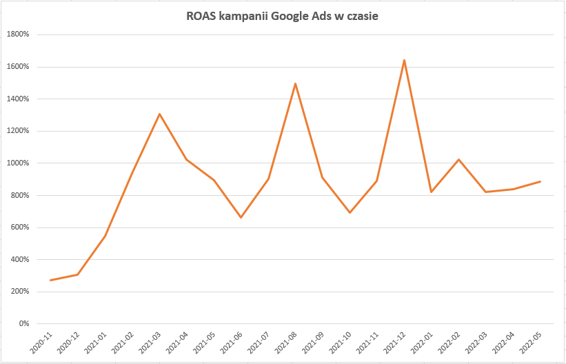 ROAS to wskaźnik określający zwrot z inwestycji. Jest to nic innego, jak stosunek przychodu z kampanii do poniesionych kosztów na tę kampanię, pomnożony przez 100%. Analizując wykres, widzimy trend wzrostowy wartości ROAS. Oczywiście, istnieją miesiące lepsze i gorsze sprzedażowo, lecz średnio trend utrzymuje się w tendencji wzrostowej. Średni ROAS przez cały cykl współpracy wynosi 888%. Oznacza to, że jedna zainwestowana złotówka w kampanię Google Ads średnio generuje 8,88 zł przychodu. W najlepszym miesiącu ROAS konta osiągnął wartość 1639% – przychody były ponad 16 razy większe niż poniesione koszty na tę kampanię.