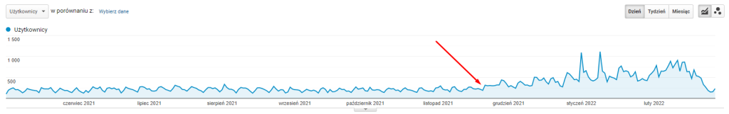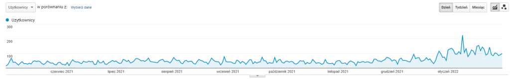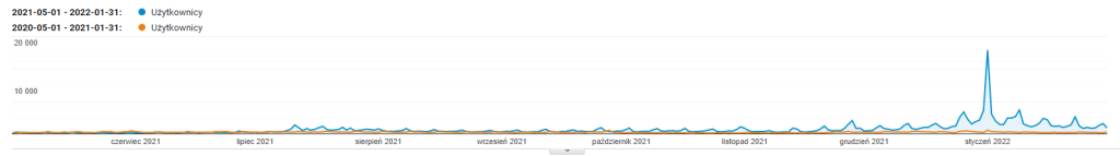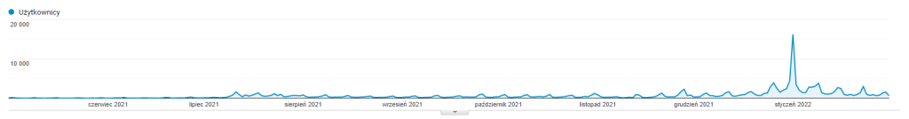 Zamieszczony powyżej zrzut ekranu zawiera niepełny obraz witryny – z analizy została wyłączona podstrona zoptymalizowana pod hasła związane z wirtualnym alkomatem. Z uwagi na swoją popularność w bezpłatnych wynikach wyszukiwania mocno zaburzyła ona wykres kliknięć i wyświetleń w dniu 1.01.2022:
