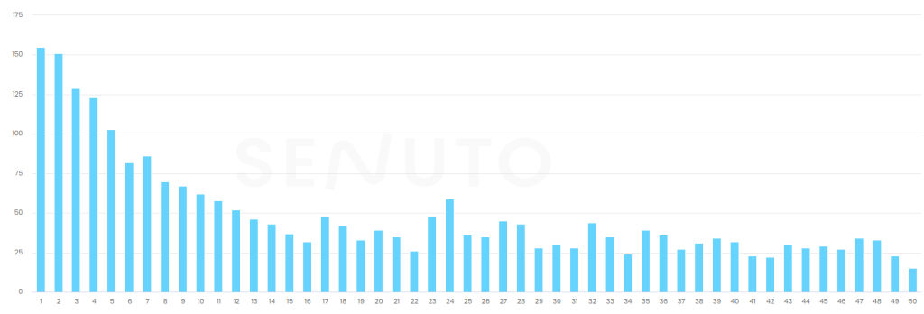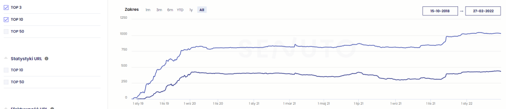 Dobrze prowadzona strategia pozwoliła na budowanie widoczności głównie w zakresie TOP 3 (liczba fraz dla tych trzech pierwszych pozycji w przypadku tego klienta jest największa) – w tym zakresie znajdują się frazy związane z kategoriami, podstronami doprecyzowanymi o nazwy miast oraz produktami klienta, dzięki czemu możemy powiedzieć, że osiągamy założone cele: