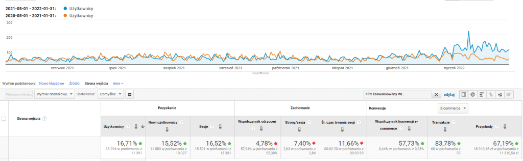 W czasie naszej dotychczasowej współpracy (maj 2021 – luty 2022) udało się zwiększyć ruch organiczny o 167,65% w porównaniu do roku poprzedniego: