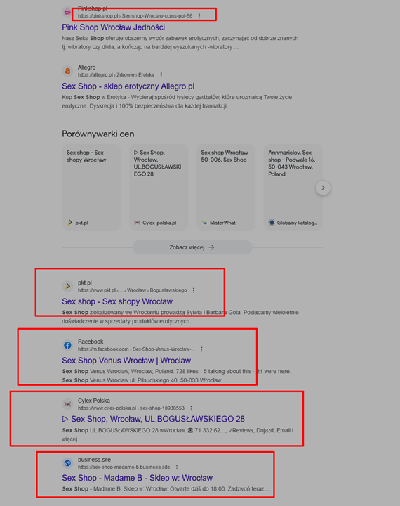Kolejną trudnością, która cyklicznie pojawia się w tej branży, jest geolokalizowanie części zapytań. Najczęściej raz na kilka miesięcy, trwając przez 24-48 h dla fraz typu „sex shop”, Google zaczyna zwracać wyniki regionalne. Oznacza to, że będąc przykładowo we Wrocławiu, wyszukiwarka wyświetli same strony pochodzące z tej lokalizacji: