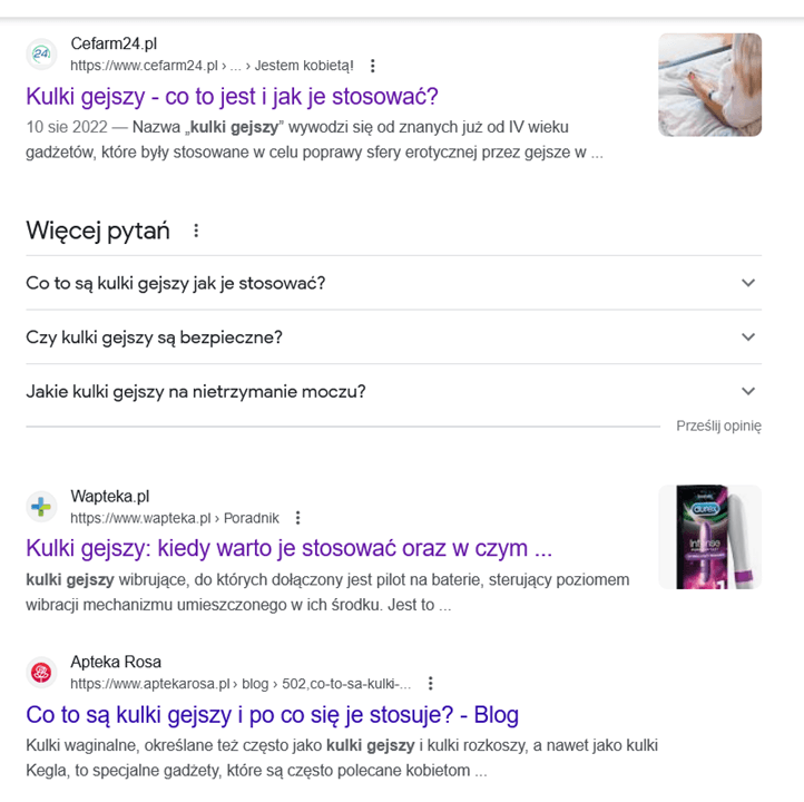 Jak możemy zaobserwować na powyższym zrzucie ekranu, jedyny typowy sklep erotyczny znajdujący się w TOP 10 stanowił Secret Delivery. Wysoką pozycję zajął jednak typowy wpis blogowy, co wpasowało się w intencje, które Google dopasował sobie do tego zapytania.