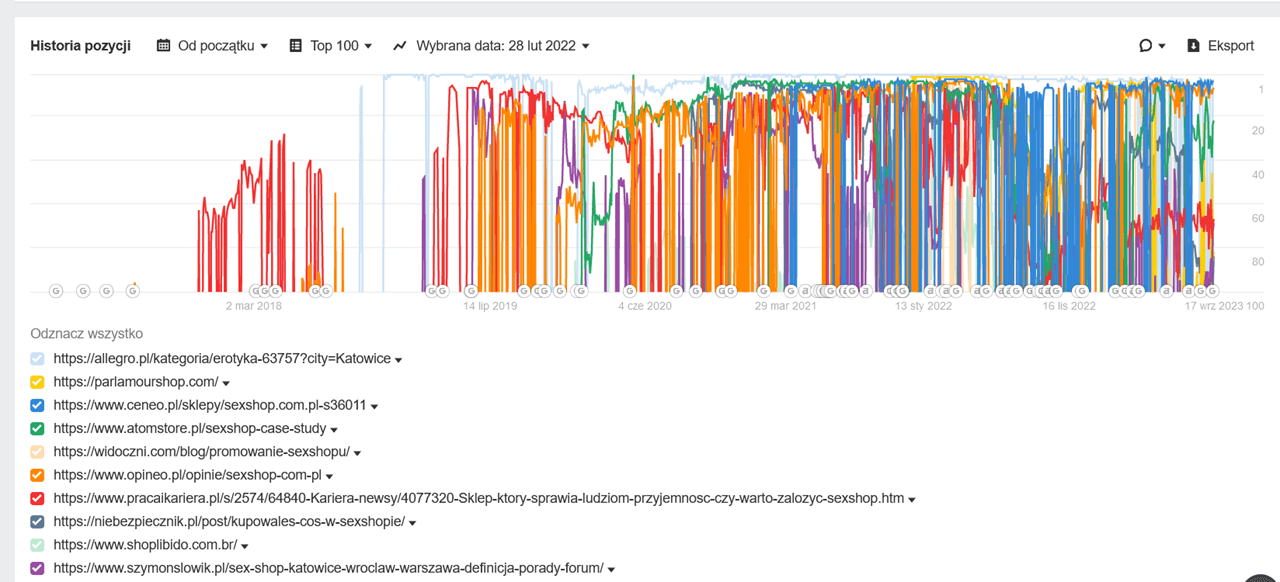 Historycznie bardzo analogicznie wyglądała sytuacja w przypadku innych zapytań dotyczących kategorii czy ogólnych fraz jak „sex shop” oraz „sexshop”. Aktualnie zajmujemy dla tych zapytań TOP 1: