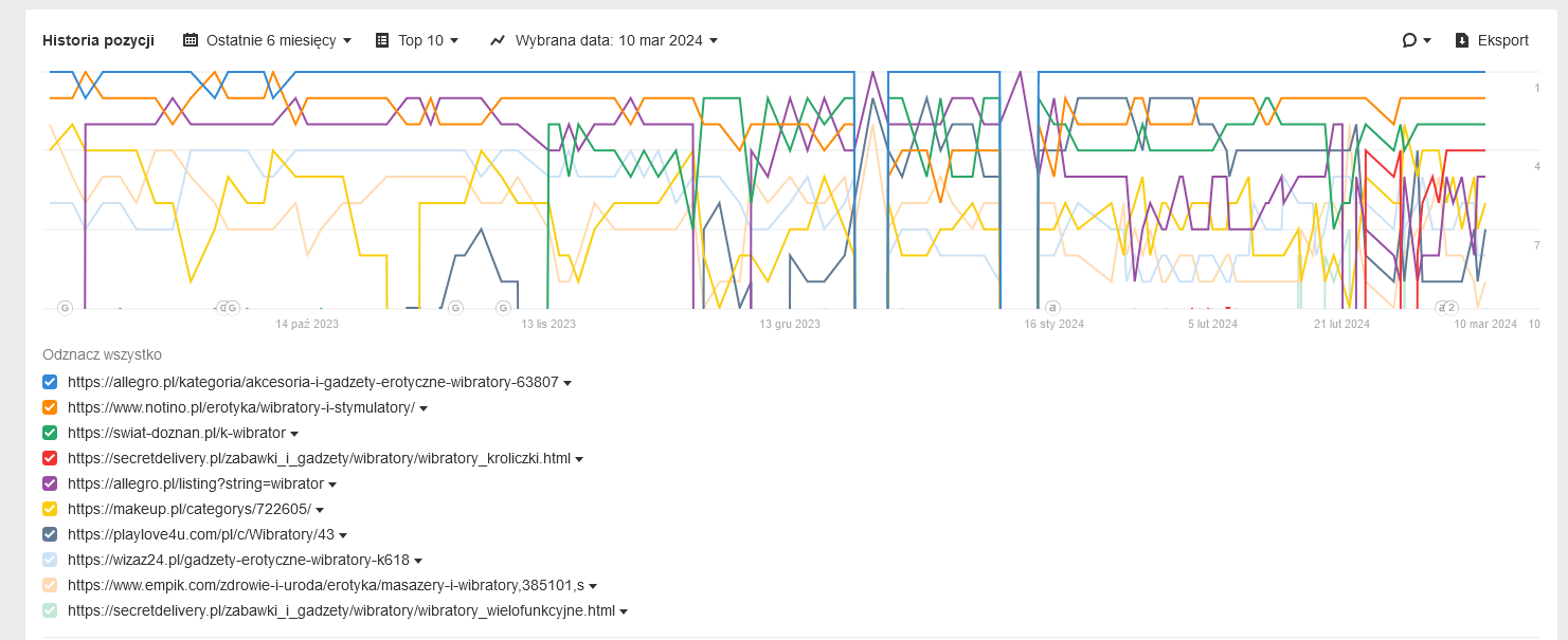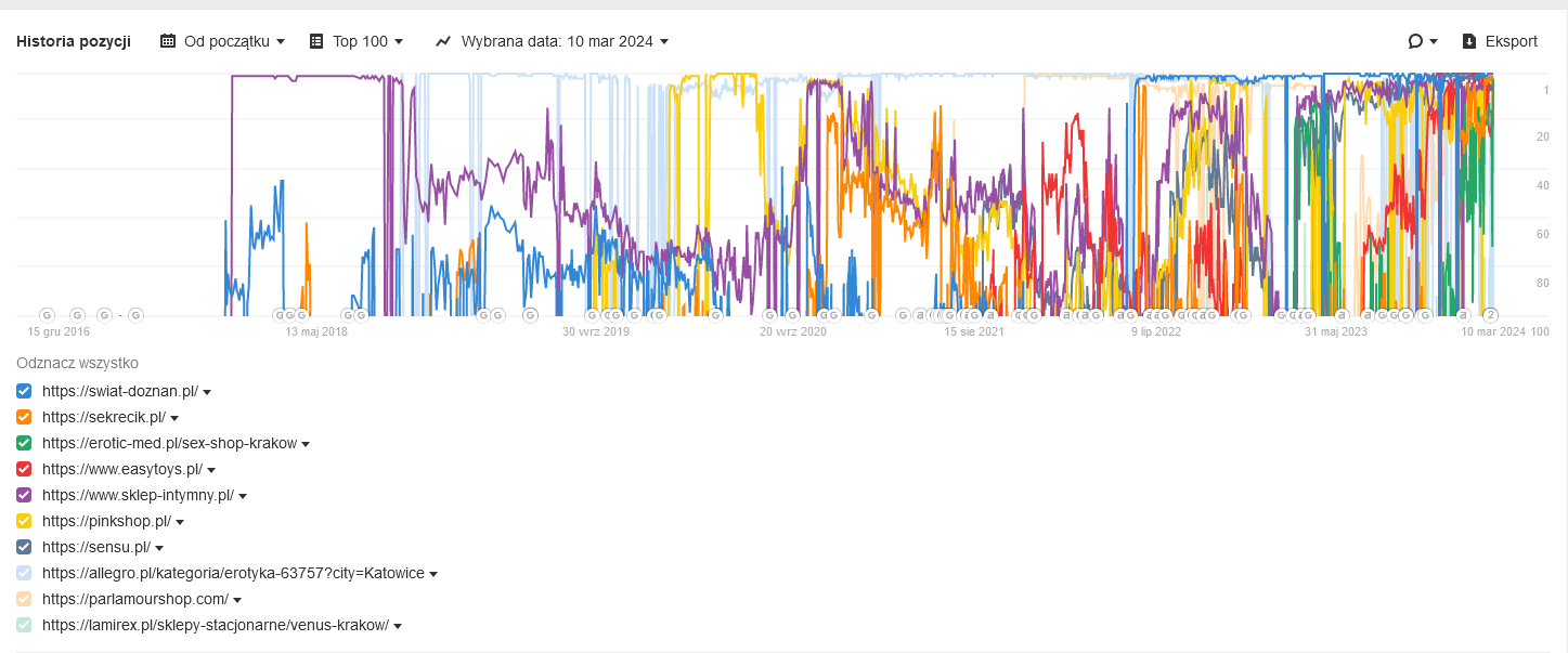 Powyższy zrzut ekranu pokazuje, jak wiele zmian w obrębie TOP 10 następuje w ciągu miesięcy. Ponownie jednak coraz częściej wśród najlepszych wyników pojawiają się typowe sklepy erotyczne, a nie tylko takie, w których erotyka stanowiła mały procent całości asortymentu.