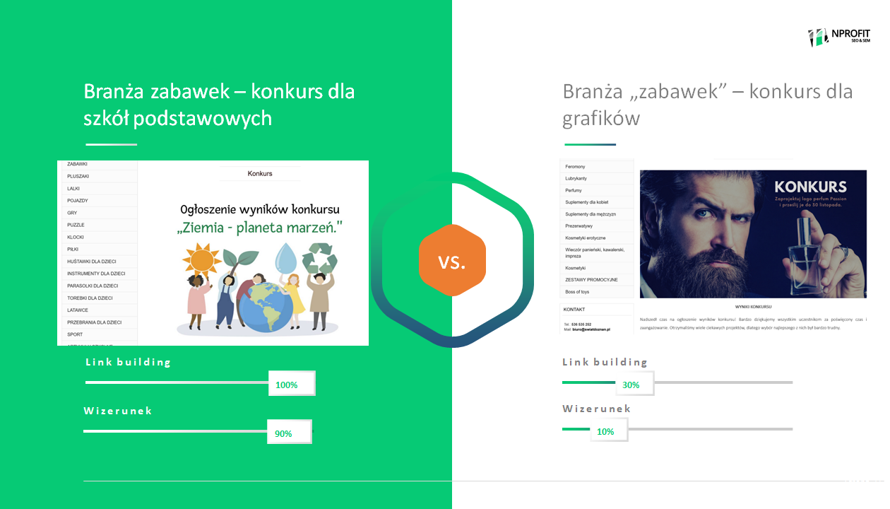 Jedną z ciekawszych taktyk, którą zastosowaliśmy w innym naszym sklepie internetowym, było zorganizowanie konkursu dla szkół podstawowych oraz przedszkoli. Warunki uczestnictwa obejmowały jednak umieszczenie linku „follow” na stronie internetowej oraz poinformowanie o udziale w konkursie. Dodatkowo zadbaliśmy o partnerstwa w obszarze stron gmin, miast czy portali lokalnych. W ten sposób za pośrednictwem 2. edycji konkursu byliśmy w stanie pozyskać linki z kilkuset domen – w dodatku z miejsc, gdzie najczęściej nie da się kupić linków SEO.