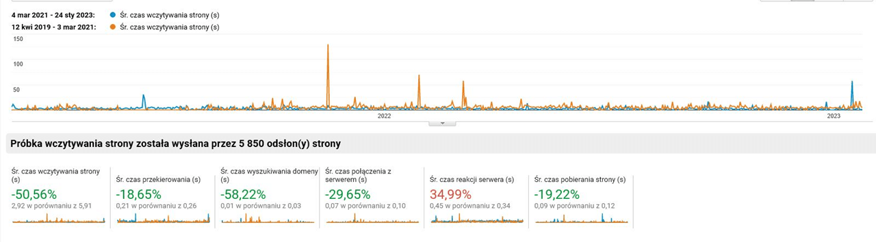 Ze względu na ograniczenia technologiczne w tym celu wykorzystaliśmy płatną wersję platformy Cloudflare i jej możliwości. Pozwoliło nam to zmniejszyć średni czas wczytywania strony (na bazie danych Google Analytics) o połowę. Doskonale oddaje to poniższy zrzut ekranu: