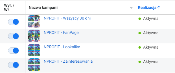 Należy tutaj wspomnieć, że na koncie reklamowym mamy już kampanie, która trafia właśnie do tej grupy odbiorców. Kampania ta nazywa się „NPROFIT – Fanpage” i zawiera zestaw reklam „Fani Fanpage”, który trafia do wspomnianej grupy odbiorców. Mając na uwadze powyższe, równoległe trafianie do tej samej grupy odbiorców byłoby marnowaniem budżetu reklamowego. Zależy nam, aby każda kampania znajdywała unikatowego odbiorcę. Takie zarządzanie strukturą kampanii pozwoli nam na maksymalizacje szans na sukces.