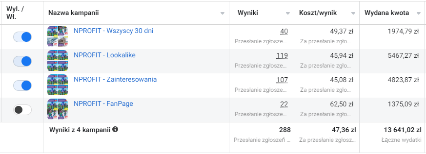 Wyniki przeprowadzonej kampanii Facebook Ads