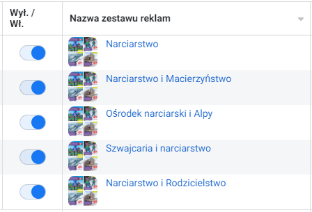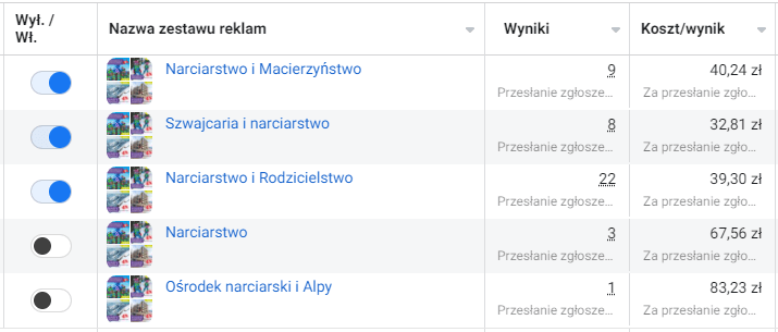 Zestawy reklam zawierające odbiorców zainteresowanych tematyką „Narciarstwa” oraz „Ośrodka narciarskiego i Alp” zostały wyłączone, gdyż koszt konwersji dla tych grup był za wysoki. Dzięki wykluczeniu tych grup z kampanii dostępny budżet został przekierowany na zestawy reklam odznaczające się lepszą efektywnością pod kątem „koszt/wynik”.