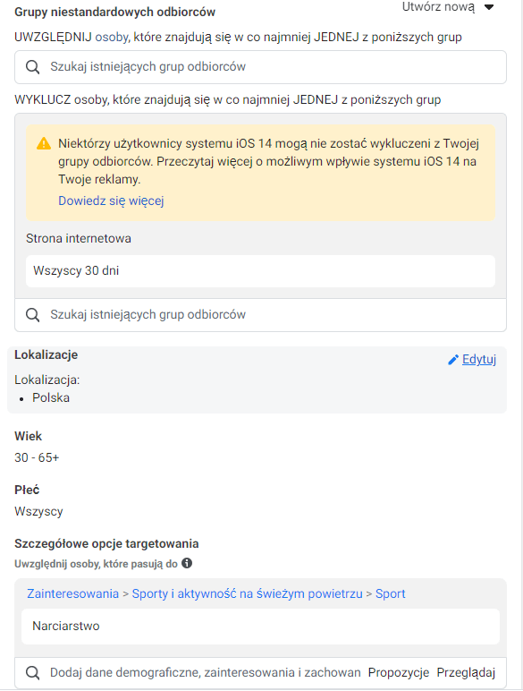 W zestawie reklam należącym do kampanii „NPROFIT – Zainteresowania”, trafiającym do osób zainteresowanych tematyką „Narciarstwa” wykluczona została grupa remarketingowa „Wszyscy 30 dni”. Grupa skierowana na nowych odbiorców ma co do zasady trafiać do nowych odbiorców zainteresowanych danym tematem. Nie chcemy, aby budżet zarezerwowany na tę kampanię trafiał do osób z grupy remarketingowej, gdyż dla tych osób została utworzona specjalna kampania „NPROFIT – Wszyscy 30 dni”. Trafianie do tych samych osób za pomocą różnych kampanii wiąże się z marnowaniem budżetu. Należy mieć na uwadze, że osoby, które w ciągu 30 dni odwiedziły stronę Biura Podróży, faktycznie według algorytmów Facebook mogą być kwalifikowane jako osoby zainteresowane tematem narciarstwa, dlatego też rozsądnie będzie je wykluczyć z kampanii.
