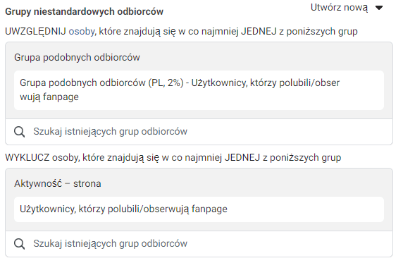 Dlaczego zdecydowano się na podjęcie tego typu wykluczenia? Odpowiedź jest bardzo prosta. Każda grupa podobnych odbiorców w mechanizmie swojego działania prócz nowych odbiorców wyświetla swoje reklamy również grupie bazowej. W tym przypadku grupą bazową są „osoby, które polubiły/obserwują fanpage”.