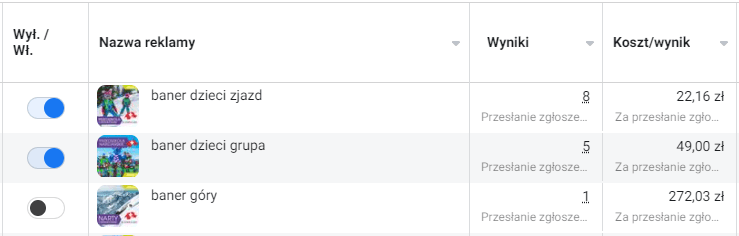 Jak można zauważyć powyżej – baner, dla którego koszt konwersji wyniósł 272,03zł został wykluczony z zestawu reklam. Pozostałe banery, dla których koszt konwersji był tańszy, nadal były w kampanii aktywne.