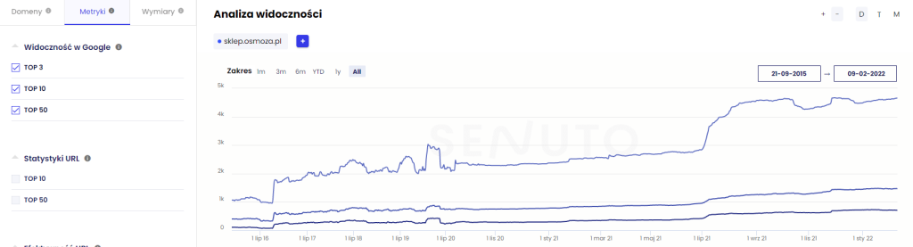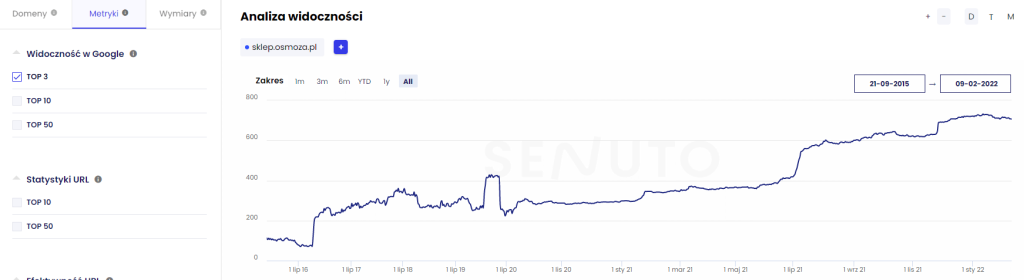 W przypadku tego klienta nie zaczynaliśmy z czystą kartą – przyszedł do nas z już dość dużym zakresem słów kluczowych w TOP 50, co było dobrym startem i podłożem pod dalszą pracę. Widoczność sklep.osmoza.pl w momencie rozpoczęcia współpracy prezentowała się następująco:
