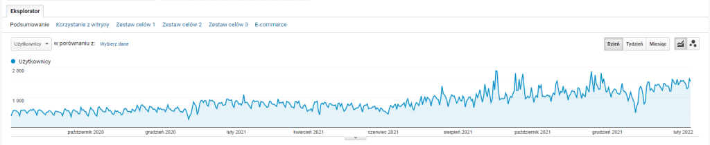 Dzięki zwiększeniu widoczności udało nam się bardzo poprawić ruch organiczny na stronie klienta. Poniżej znajduje się wykres ruchu z bezpłatnych wyników wyszukiwania od sierpnia 2020 roku do 7.02.2022 roku.