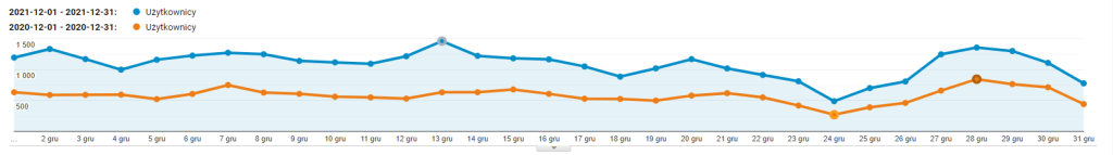 Ruch na stronie stale rośnie, co widać na wykresie porównawczym rok do roku, w grudniu 2021 i 2020: