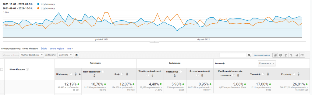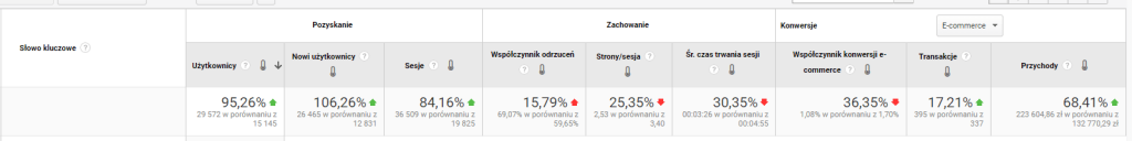 Dane przedstawione na tym wykresie wskazują, że w analizowanych okresach udało nam się zwiększyć ruch na stronie klienta o 95,26%, tym samym podnosząc jego przychód brutto o niespełna 70%.