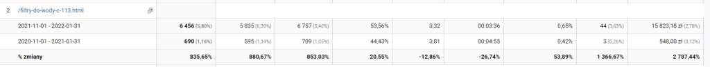 Analizując dane z ostatniego kwartału w porównaniu do roku poprzedniego, można stwierdzić, że jedną z podstron, które znacznie poprawiły swoje wyniki, jest kategoria filtrów do wody, czyli kluczowych produktów w ofercie klienta: