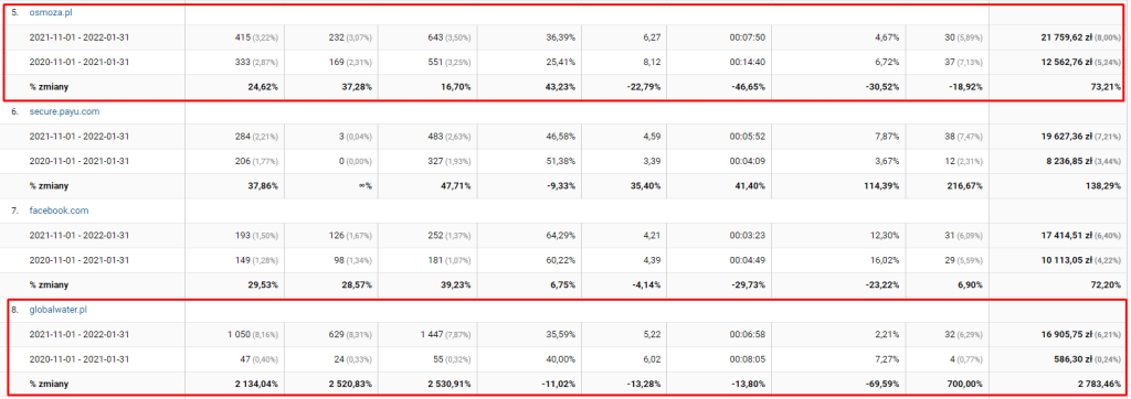 Wysoki budżet przeznaczany na pozycjonowanie pozwolił nam również na rozbudowywanie stron blogowych klienta, które znajdują się na osobnych domenach. Analizując dane za ostatni kwartał (listopad – styczeń), możemy zauważyć, że strategia ta przyczyniła się do zwiększenia ruchu oraz przychodów ze wspomnianych domen – tym samym znalazły się one w czołówce stron odsyłających pod kątem generowanych przychodów:
