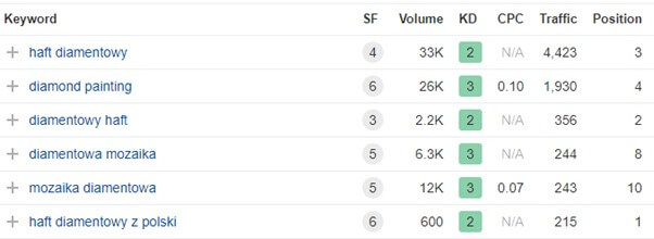 Nasza praca z klientem koncentruje się na osiągnięciu trzech głównych celów. Szczególny nacisk położyliśmy na wzrost widoczności strony internetowej w Google na frazy związane z kategorią haftu diamentowego. To z kolei miało skutkować zdobyciem cennego ruchu użytkowników z wyników organicznych oraz wzrostem sprzedaży na stronie internetowej.