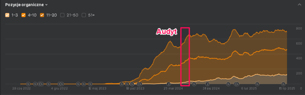 Klient przyszedł do nas posiadając już pewną widoczność. Jako że strona była już rozbudowana, skupiliśmy się bardziej na wzmacnianiu już rankujących fraz, niż na wprowadzaniu nowych fraz na stronę. Nasze działania stopniowo przerzucają frazy z TOP 50 do TOP 10, a następnie do TOP 3.