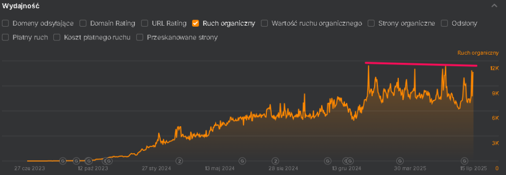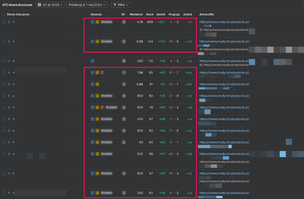 Dodatkowo wdrażamy zmiany techniczne w obrębie serwisu, w tym poprawę struktury linkowania wewnętrznego i uporządkowanie elementów nawigacyjnych. Monitorujemy wyniki za pomocą Google Search Console, GA4 oraz narzędzi analitycznych, takich jak Ahrefs i SemStorm, aby móc reagować na zmiany w widoczności oraz modyfikować strategię zgodnie z aktualnymi potrzebami strony i zmieniającym się algorytmem Google.