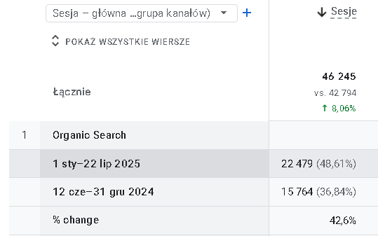 Oczywiście widoczność przy danej strategii miała bezpośredni wpływ na wzrost wizyt z ruchu organicznego. Od początku tego roku w porównaniu z poprzednim okresem wzrost sesji w tym medium wyniósł 42%.