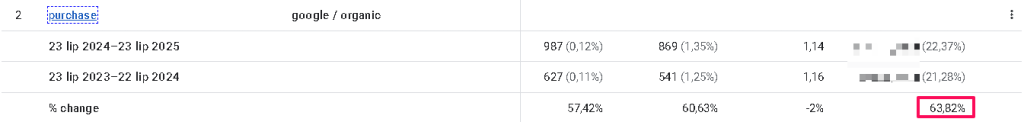 Wzrost ruchu na stronie ma także bezpośredni wpływ na sprzedaż. Skupienie się na poprawie fraz już rankujących, pochodzących z kategorii i produktów spowodowało, że licząc rok do roku, przychód z medium organicznego zwiększył się o ponad 63%.