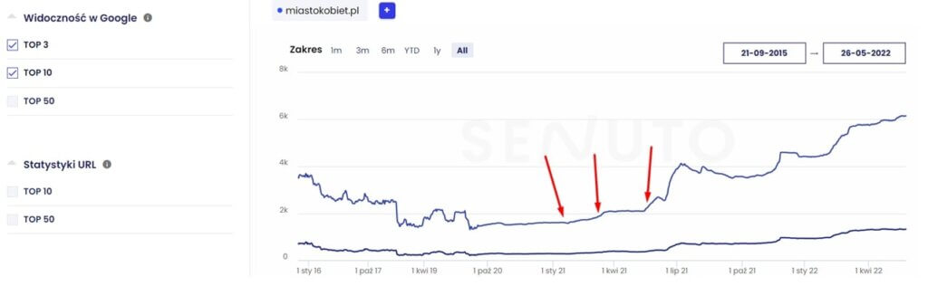 Szczególnie istotne są duże wzrosty w TOP10 i TOP3 – jako że generują one największe zmiany w ruchu na witrynie.