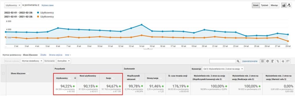 W pierwszym miesiącu współpracy, przed realizacją naszej strategii ruch organiczny na stronie wynosił 43 352 użytkowników. Porównując wzrosty rok do roku – w lutym 2022 ilość użytkowników wynosiła już 84 200, co daje nam wzrost na poziomie ponad 94%