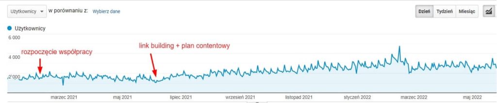Z czasem nacisk z działań na stronie i szkoleń został przeniesiony na realizację strategii off-site. Dzięki systematycznemu link buildingowi z naszej wewnętrznej infrastruktury udało się wzmocnić efekty wcześniej wymienionych działań, dbając o wysokie pozycje w wynikach wyszukiwania oraz o korzystny profil linkowy.