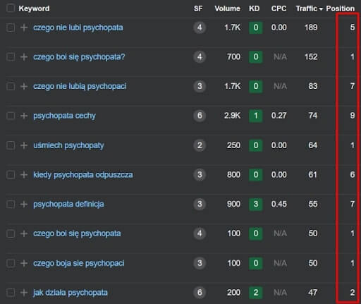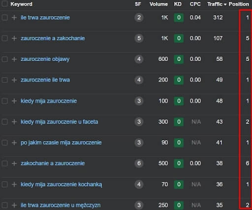 Przyglądając się przykładowym wpisom z planu contentowego warto zwrócić uwagę na pozycje w TOP10 (a nawet w TOP3), które udało się zająć: