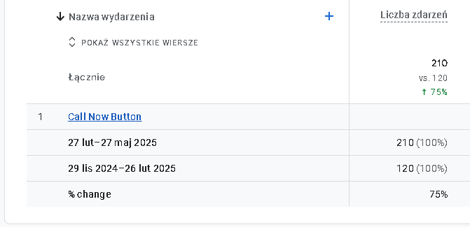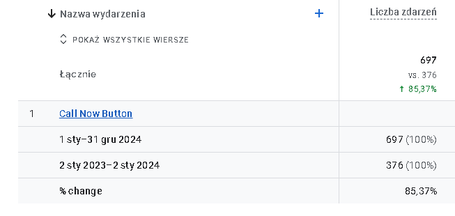 Oczywiście nie jest to pusty ruch na stronach informacyjnych, a taki, który prowadzi do konwersji, dlatego analogicznie do powyższych zrzutów ekranu, kliknięcia w telefon w poprzednim roku w porównaniu do roku 2023 wzrosły o 85%:
