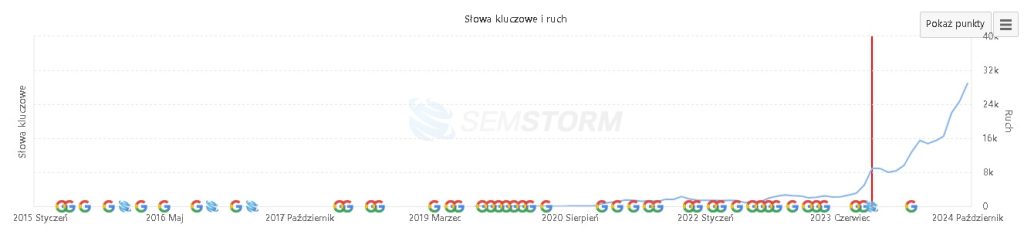 Jest to naturalne w przypadku pozycjonowania głównie przez link-building. Linki potrzebują czasu, aby być powiązane z domeną docelową. Tworzenie autorytetu linkami też trwa trochę dłużej. Niemniej jednak, w momencie kiedy link-building “zaskoczy”, widać nagły wzrost.