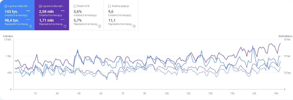 Gdy Porównamy tylko ostatnie 6 miesięcy z poprzednim okresem, analiza danych wykazuje, że udało nam się osiągnąć 45% wzrost kliknięć z 98,4 tysięcy na 143 tysiące.