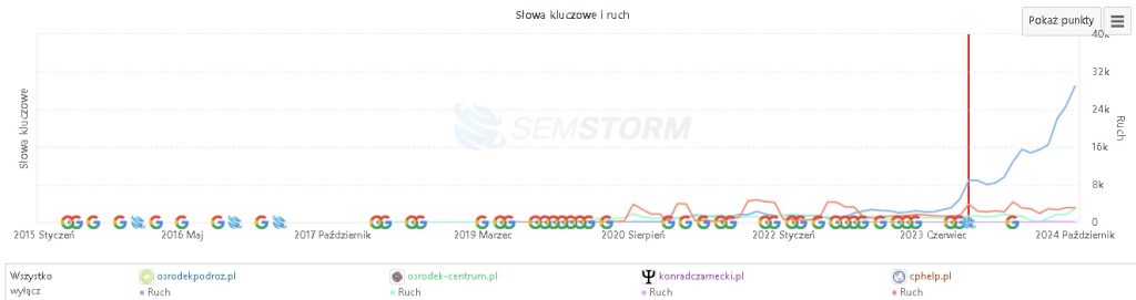 Gdy porównamy wyniki osrodekpodroz.pl z wynikami innych centrum psychoterapii w Warszawie na frazę “ośrodek psychoterapii Warszawa”, od razu widać, że działania SEO przynoszą duże efekty.