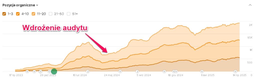 Klient nawiązał współpracę w momencie kiedy występował na stronie trend spadkowy widoczności. Już po wdrożeniu audytu udało się spadki zatrzymać, a następnie odwrócić trend i od tamtego momentu utrzymujemy trend wzrostowy we frazach TOP 1-20.
