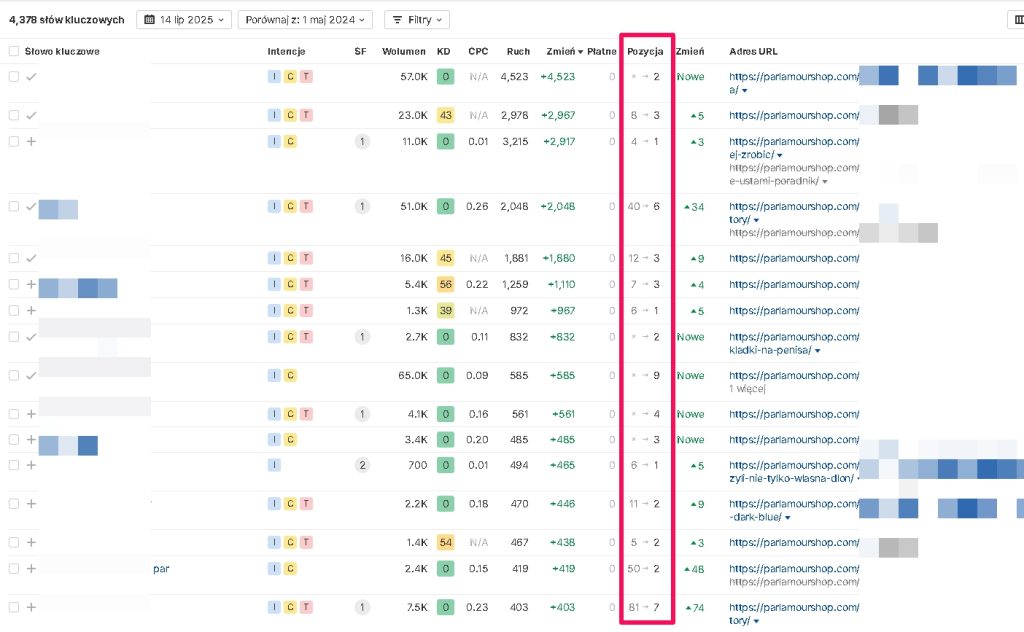 Jako że jest to strona e-commerce, naszym głównym celem była promocja fraz sprzedażowych opartych na kategoriach i konkretnych produktach. W branży erotycznej jest to o tyle utrudnione, że Google często nie pozwala niektórym frazom rankować, ponieważ przypisuje im nieodpowiednie intencje. W przypadku parlamourshop.com udało się nam wybić wiele głównych fraz sprzedażowych do TOP 10 i gwarantują one dużą część ruchu na stronie.