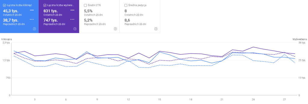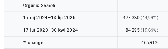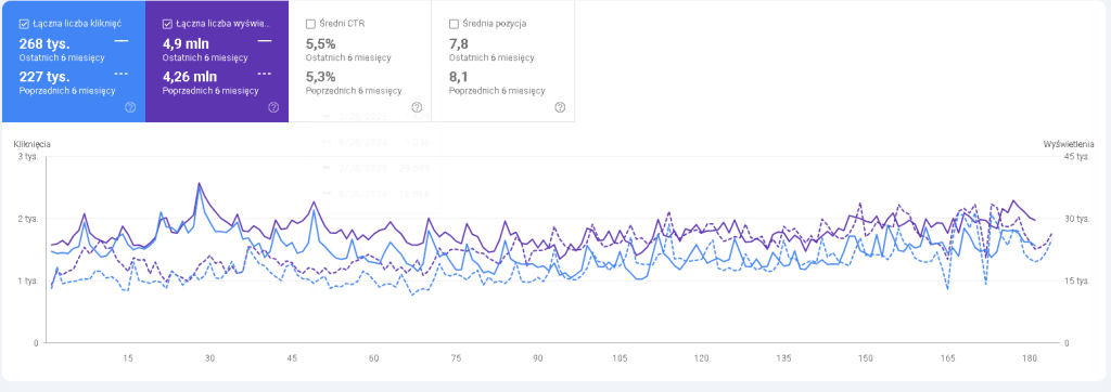 Dane ruchu z Google Analytics pokrywają się z danymi z Google Search Console, który wykazuje comiesięczny wzrost o 15-20%. W okresie ostatnich 6 miesięcy (w porównaniu z poprzednim okresem) wzrost ten wyniósł 18%.