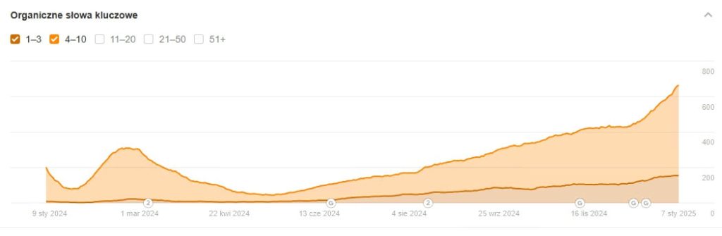 Strona podczas powstawania wchłonęła poprzednie przedsięwzięcie Klienta. Przekierowanie 301 całego poprzedniego projektu na stronę główną skutkowało pojawieniem się bardzo dużej liczby fraz TOP 1-50. Te dla nowej witryny albo nie miały już znaczenia, albo wchodziły w konflikt z podstronami, na których dane frazy miały występować. Naszym zadaniem było nakierowanie strony na odpowiednie słowa kluczowe. Poprawiając przekierowania 301 na prawidłowe podstrony oraz tworząc odpowiednie treści, udało nam się unormować sytuację z frazami, które pną się stabilnie w rankingach od maja 2024 roku.