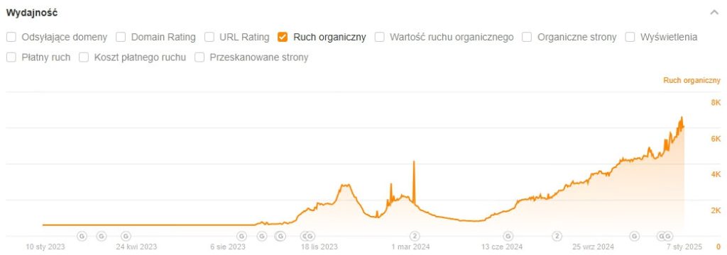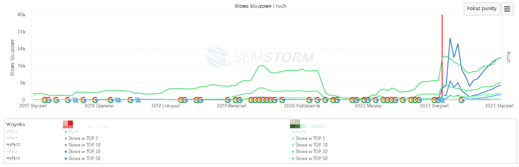 Po ustabilizowaniu i eliminacji niepotrzebnych fraz od maja 2024 r. widoczność witryny jest w trendzie rosnącym.
