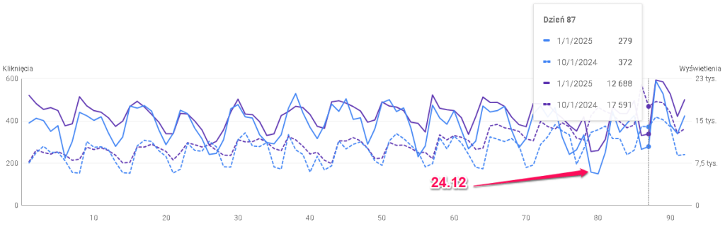 Wynik prezentuje się jeszcze bardziej zadowalająco, gdy weźmiemy pod uwagę, że przypada na okres świąteczny, który nie jest szczególnie ruchliwy dla branż związanych z maszynami rolniczymi i motoryzacją. Jedyne zauważalne spadki w tym czasie przypadają na dni świąt oraz sylwestra, kiedy ogólna aktywność w internecie jest niższa.