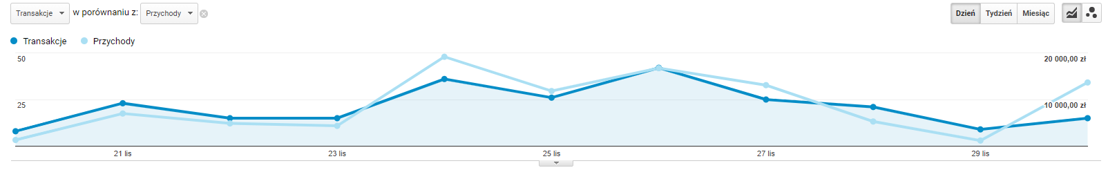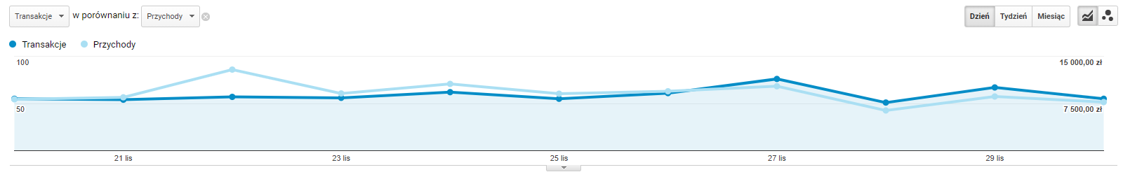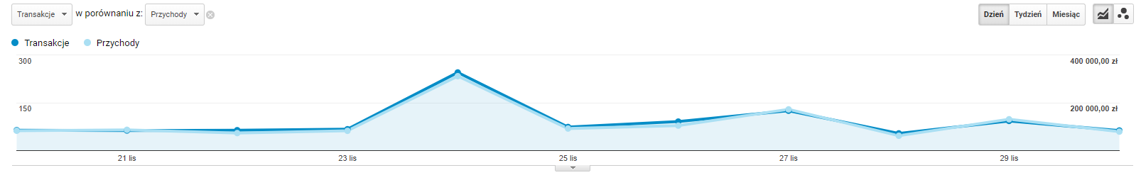 Na koniec przykład, jak nie obchodzić Czarnego Piątku. Klient z branży bieliźnianej, nie widział potencjału w tym dniu. Nie wprowadził żadnego typu promocji na sklepie, ani nie rozdawał kodów rabatowych. Jak widać, okres ten był dla niego zwykłym dniem w e-commerce.