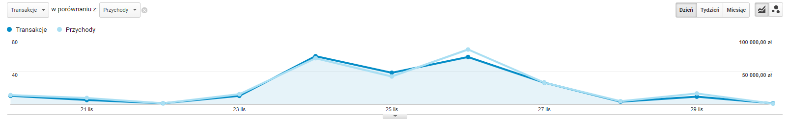 W tym wypadku klient specjalizujący się w sprzedaży galanterii i zegarków, zdecydował się, oprócz atrakcyjnych cen w „świąteczny” dzień, przedłużyć promocję o następujący weekend. Jak widać, skutecznie przełożyło się to na zwiększenie sprzedaży w całym okresie. Wykres przedstawia Black Friday z roku 2017.