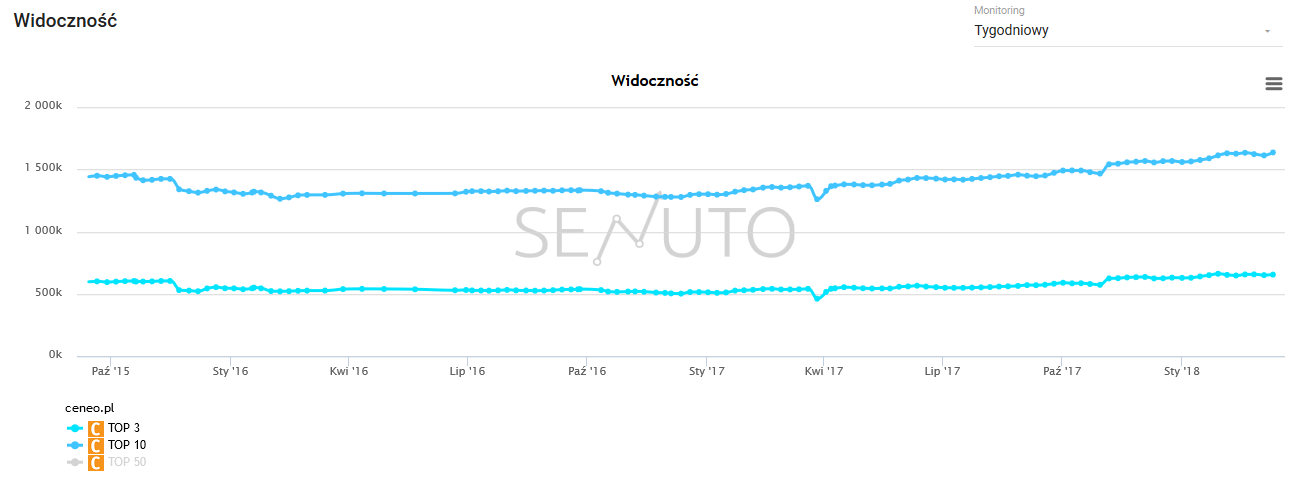 Według narzędzia monitorującego wyniki wyszukiwania Senuto, domena ceneo.pl widoczna jest w TOP 10 dla ponad 1 600 000 słów kluczowych.