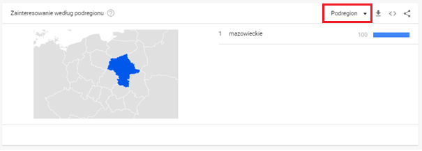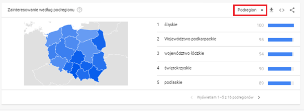 To jednak nie wszystko. Spoglądając nieco niżej, Google dostarcza danych o trendach danej frazy w zależności od konkretnego podregionu w Polsce.