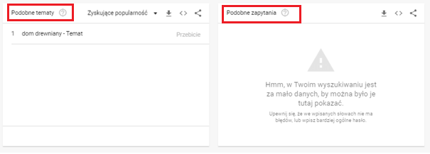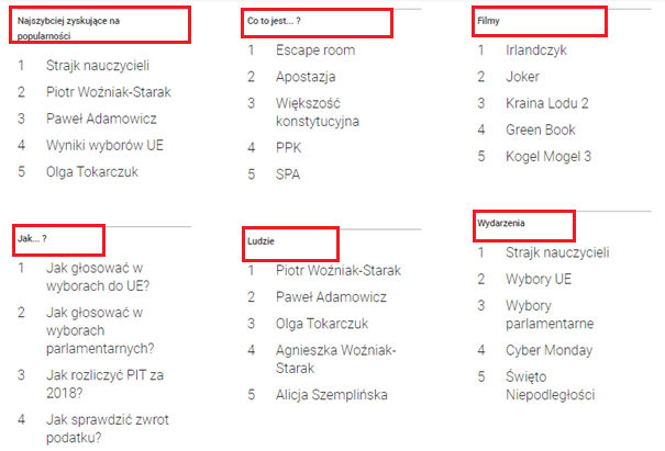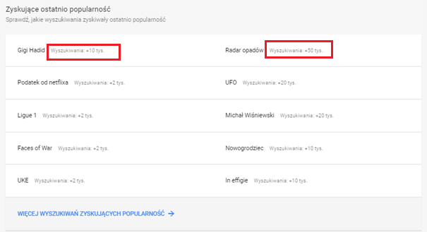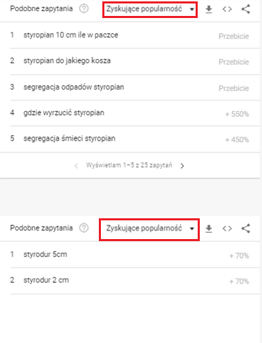 Jak widać, dane prezentujące frazy zyskujące na popularności znacznie różnią się od najczęściej wyszukiwanych.